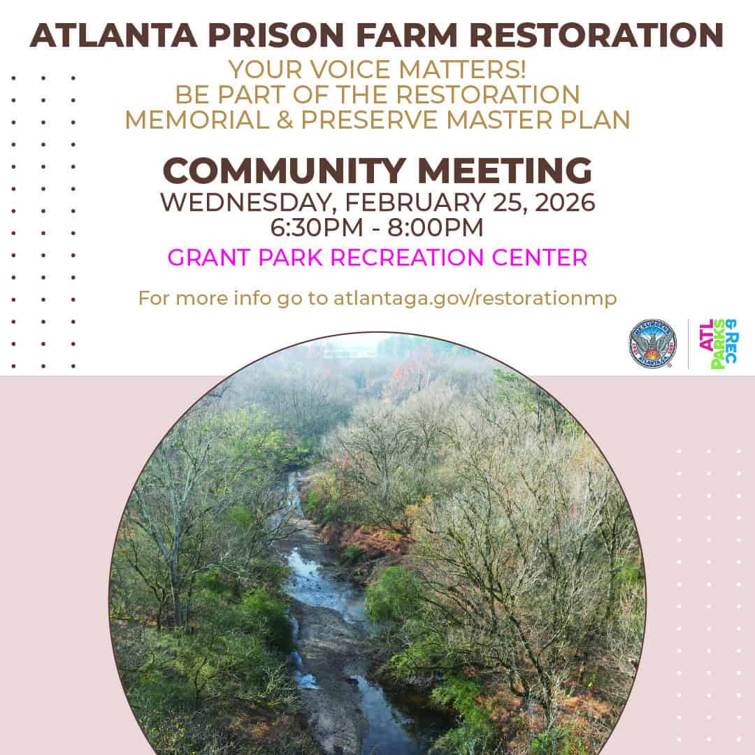 The planning effort focuses on the former Atlanta Prison Farm site — more than 100 acres of historically significant land near Intrenchment Creek within the South River watershed. The long-term vision is to create a public green space that restores the environment while honoring the site’s layered history.